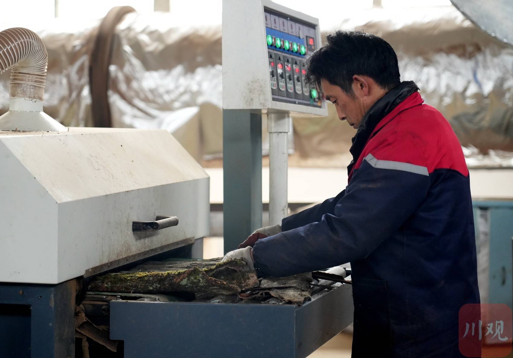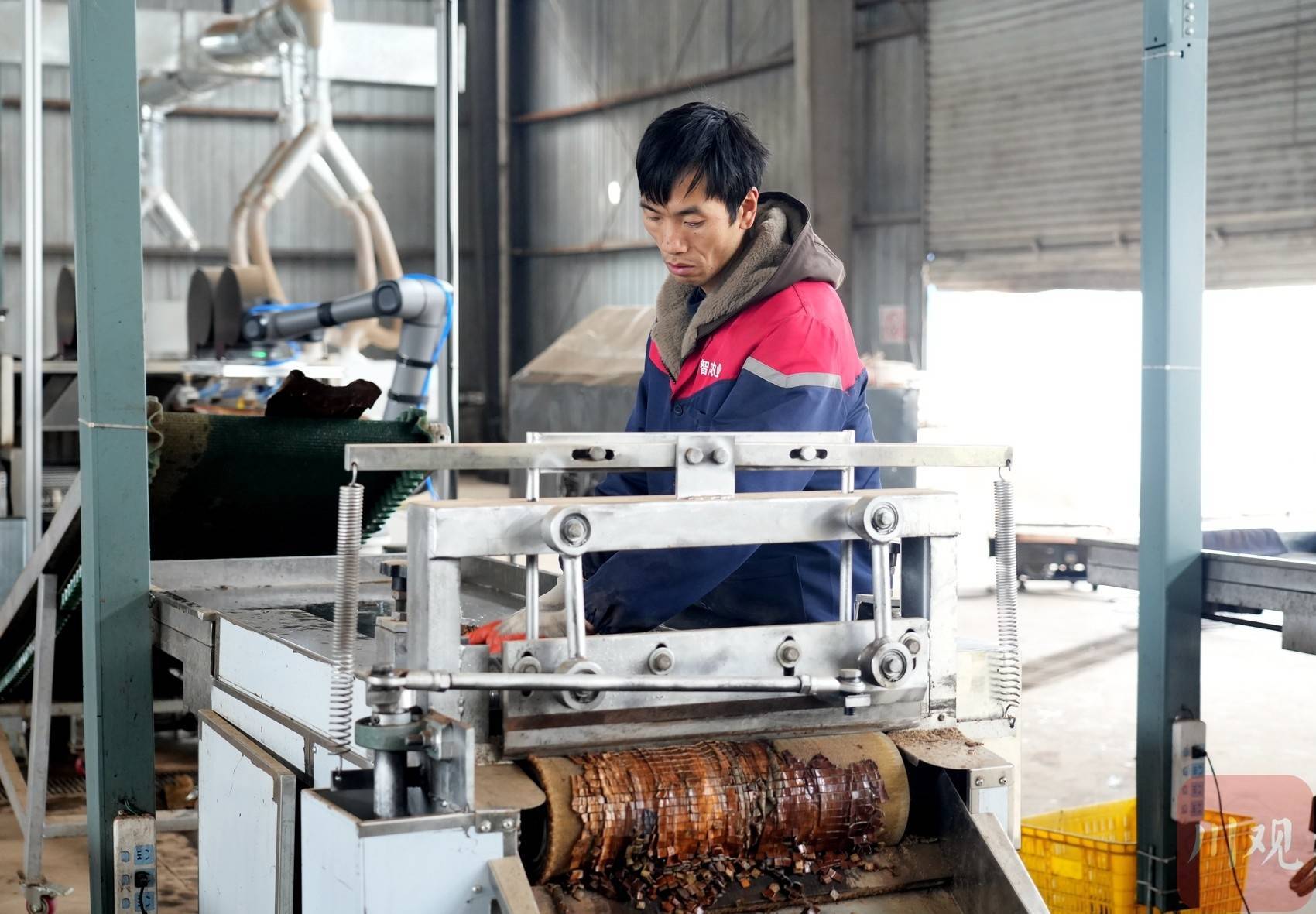 r早上八点半,操作员汪攀在限定电脑前轻点运转,一张张杜仲皮整都排队,轮番经过压平整形、自动清洗,随后被智能机械臂稳稳持取,精确移送至数控切刀之下。刀刃轨则起落间,一派片方正均匀的杜仲丁便已成形。