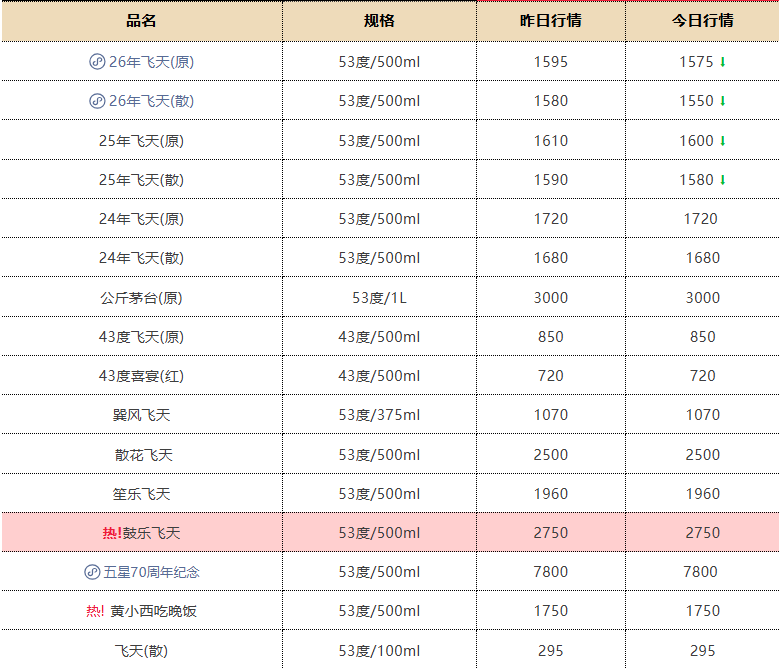 26年飞天茅台原箱较前一日下落20元,报1575元/瓶;26年飞天茅台散瓶较前一日下落30元,报1550元/瓶。
