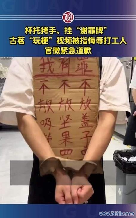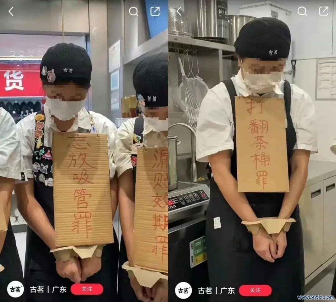 最近,古茗广东分公司在外交媒体上上传了一段视频,画面中几位衣裳古茗制服的职工双手被纸托绑住,脖子上挂着“谢罪牌”。