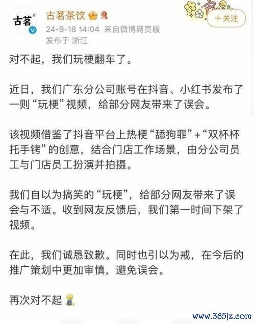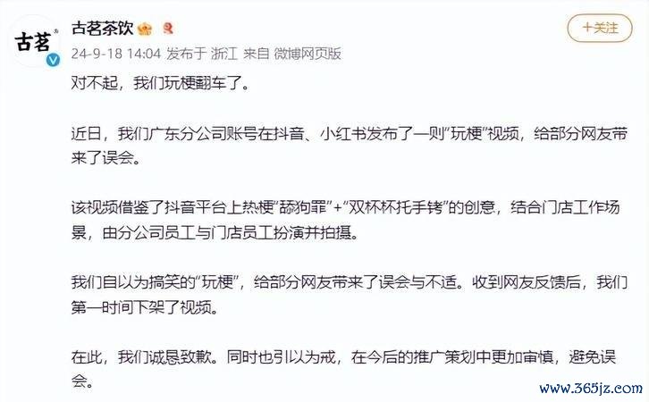 针对声威汹汹的月旦,古茗马上 reacted,在官方微博上发布了歉意声明,称这仅仅一次“玩梗”的失败尝试,并已立即下架臆度视频。