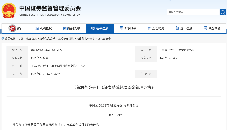 11月7日证监会与财政部聚拢发布新雠校的《证券结算风险基金料理主义》(以下简称《主义》),晓示自2025年12月8日起谨慎施行。